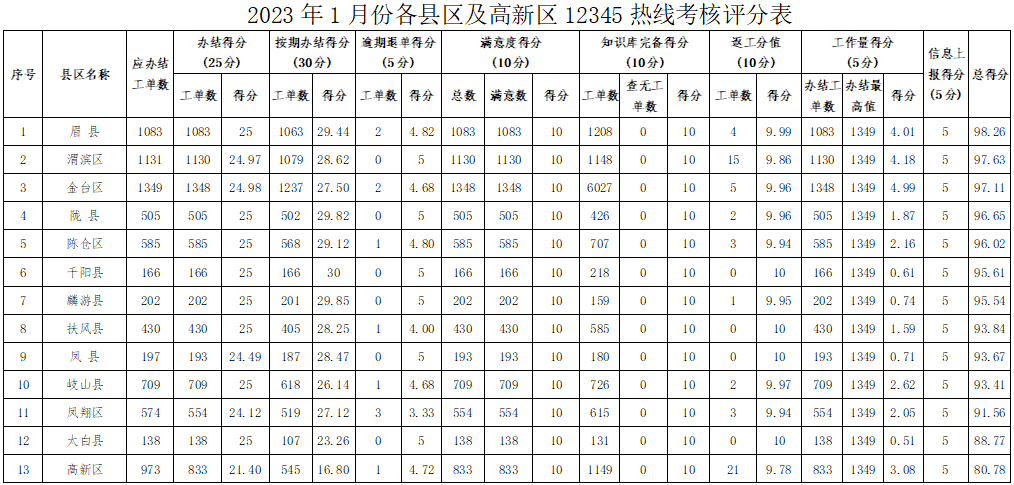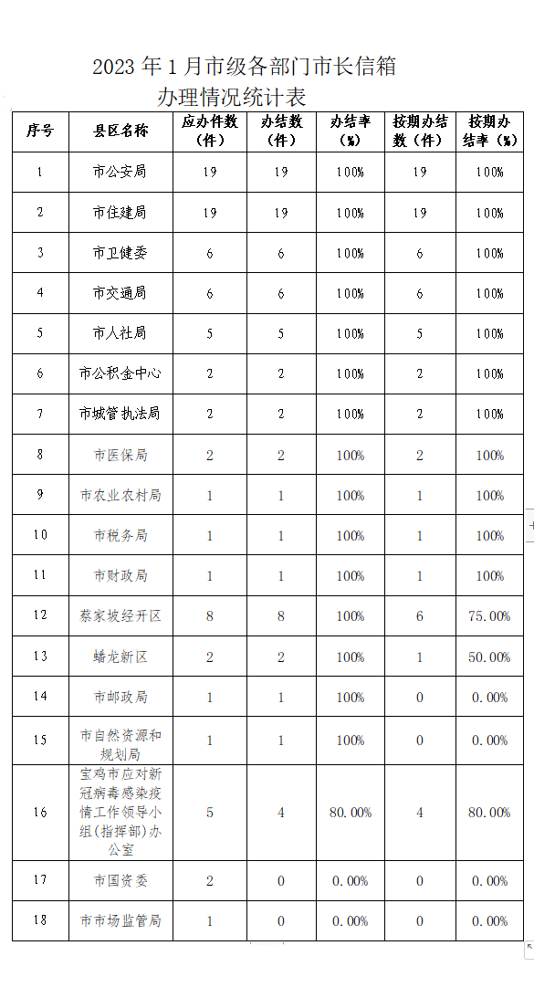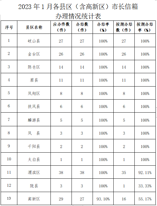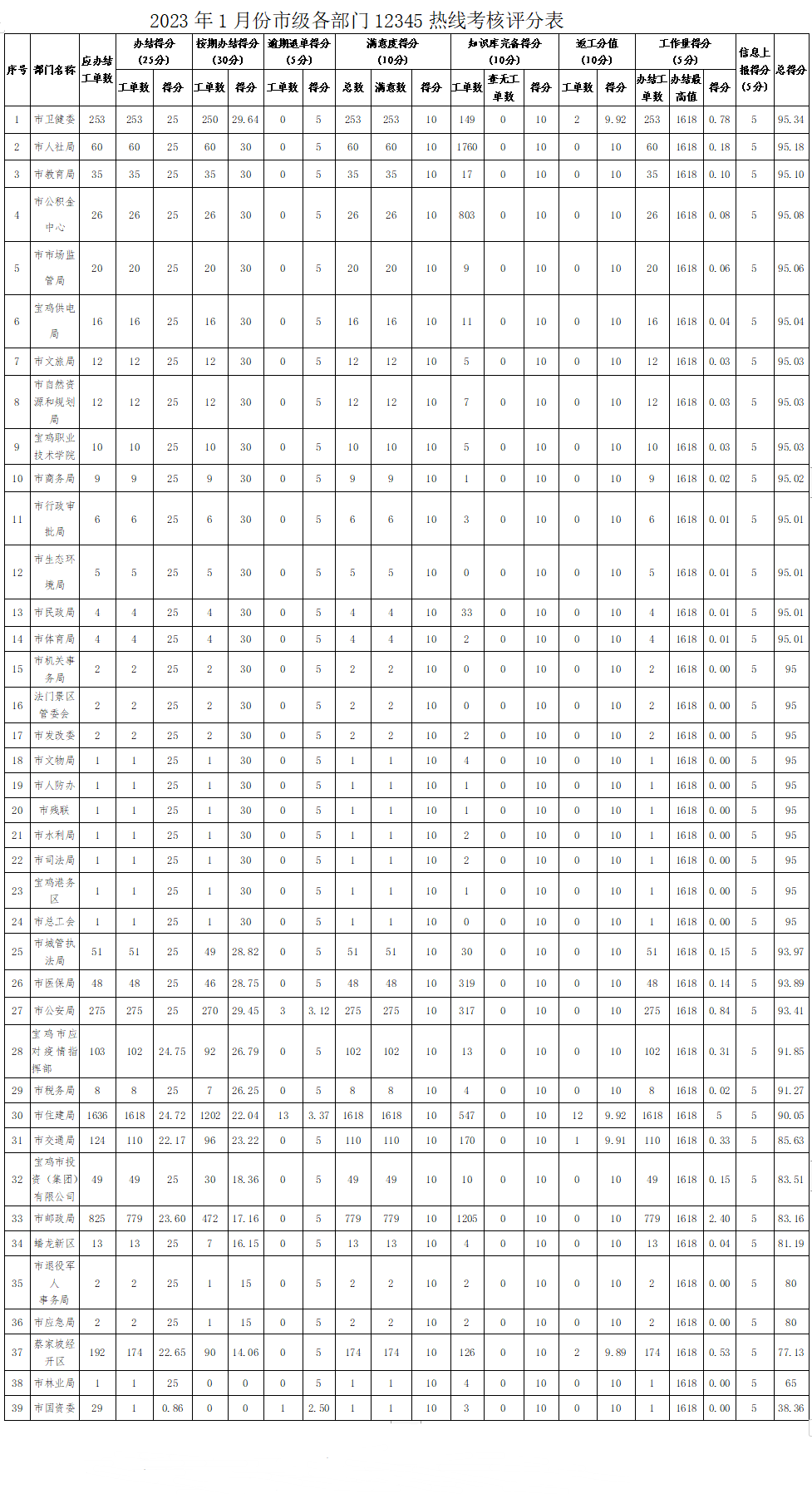2023年1月份,寶雞市12345政務(wù)服務(wù)便民熱線(“有問(wèn)必應(yīng)、接訴即辦”平臺(tái))受理企業(yè)和群眾反映的訴求36954件,應(yīng)辦結(jié)32527件,辦結(jié)32053件,辦結(jié)率98.54%,其中12345熱線渠道受理訴求35056件(包括來(lái)電33462件、省12345留言848件、微信公眾號(hào)留言650件、政府網(wǎng)站留言83件、智慧寶雞APP留言13件),應(yīng)辦結(jié)32238件,辦結(jié)31797件,總體辦結(jié)率98.63%;市長(zhǎng)信箱收到來(lái)信共372件(其中含重復(fù)信件115件),應(yīng)辦結(jié)257件,辦結(jié)251件,辦結(jié)率97.67%;人民網(wǎng)領(lǐng)導(dǎo)留言板留言28件,辦結(jié)5件;西部網(wǎng)留言13件,辦結(jié)0件。