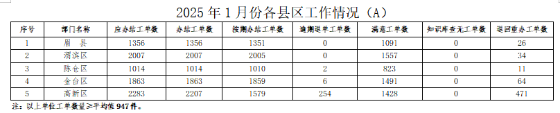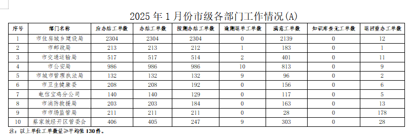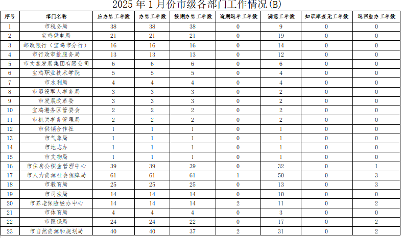 2025年1月份,寶雞市12345政務(wù)服務(wù)便民熱線(“有問必應(yīng)、接訴即辦”平臺)受理企業(yè)和群眾訴求40767件,應(yīng)辦結(jié)41158件,辦結(jié)40797件,總體辦結(jié)率99.12%。其中12345熱線渠道受理訴求40192件(包括來電37958件、省12345交辦1430件、微信公眾號留言695件、政府網(wǎng)站留言108件、短信平臺1件),應(yīng)辦結(jié)40548件,辦結(jié)40196件,辦結(jié)率99.13%;市長信箱收到來信共478件,應(yīng)辦結(jié)515件(含12月正在辦理37件),辦結(jié)508件,辦結(jié)率98.64%;人民網(wǎng)領(lǐng)導(dǎo)留言板留言91件,應(yīng)辦結(jié)89件,辦結(jié)87件;西部網(wǎng)留言6件,應(yīng)辦結(jié)6件,辦結(jié)6件。