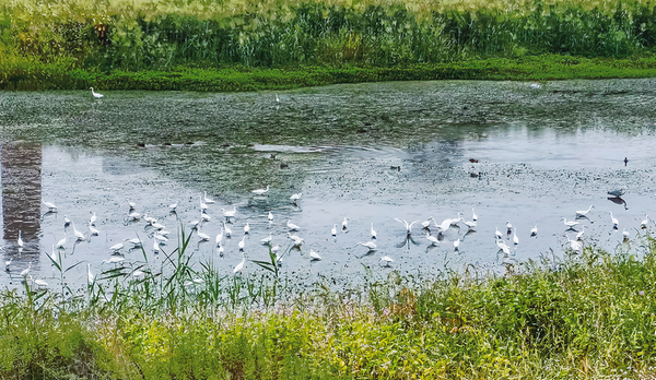 近日,家住金陵河市區(qū)段附近的市民驚喜地發(fā)現(xiàn),金陵一橋與二橋之間的河道里出現(xiàn)了一群白色的大型鳥類——白鷺,它們悠然嬉戲的場(chǎng)景,勾勒出一幅人與自然和諧共生的美麗畫面(見上圖)。