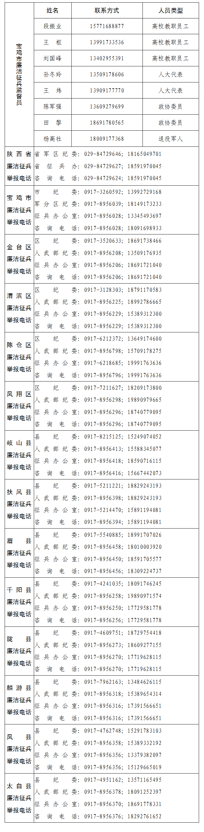 2023年上半年征兵已全面展開,為嚴(yán)明兵員征集紀(jì)律規(guī)定,筑牢廉潔征兵底線,增強(qiáng)征兵工作透明度,自覺接受群眾監(jiān)督,大力推進(jìn)全市征兵工作公開、公平、公正,現(xiàn)將寶雞市廉潔征兵監(jiān)督員相關(guān)信息及省、市、縣三級(jí)廉潔征兵監(jiān)督舉報(bào)方式予以公布。歡迎社會(huì)各界對(duì)我市征兵工作進(jìn)行監(jiān)督,廣大群眾一旦發(fā)現(xiàn)相關(guān)線索,可及時(shí)撥打舉報(bào)電話,一經(jīng)查實(shí)將嚴(yán)肅查處。