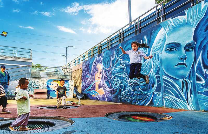 小游園里藏著巧心思。在市區(qū)金渭大橋北端的小游園里,利用空閑墻面繪制的電影《哪吒2》主題墻繪格外亮眼,哪吒、申公豹、敖丙等一系列電影里的角色被刻畫得栩栩如生,同時利用有限空地設(shè)計的跳床、滑梯、蹺蹺板等設(shè)施,讓這里成為孩子們的樂園。
