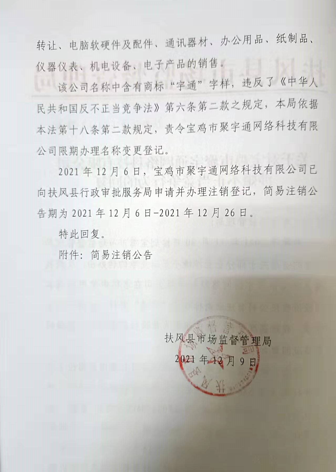 關(guān)于寶雞市聚宇通網(wǎng)絡(luò)科技有限公司涉嫌不正當(dāng)競(jìng)爭(zhēng)行為處理情況的回復(fù)