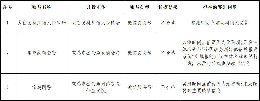 新公安”、太白縣桃川鎮(zhèn)人民政府“太白縣桃川鎮(zhèn)人民政府”微信訂閱號(hào)監(jiān)測(cè)時(shí)間點(diǎn)前兩周內(nèi)無更新,為不合格政務(wù)新媒體。其中,“寶雞網(wǎng)警”微信服務(wù)號(hào)在二季度通報(bào)問題整改完成后,三季度又因同一問題,再次被判定為不合格。