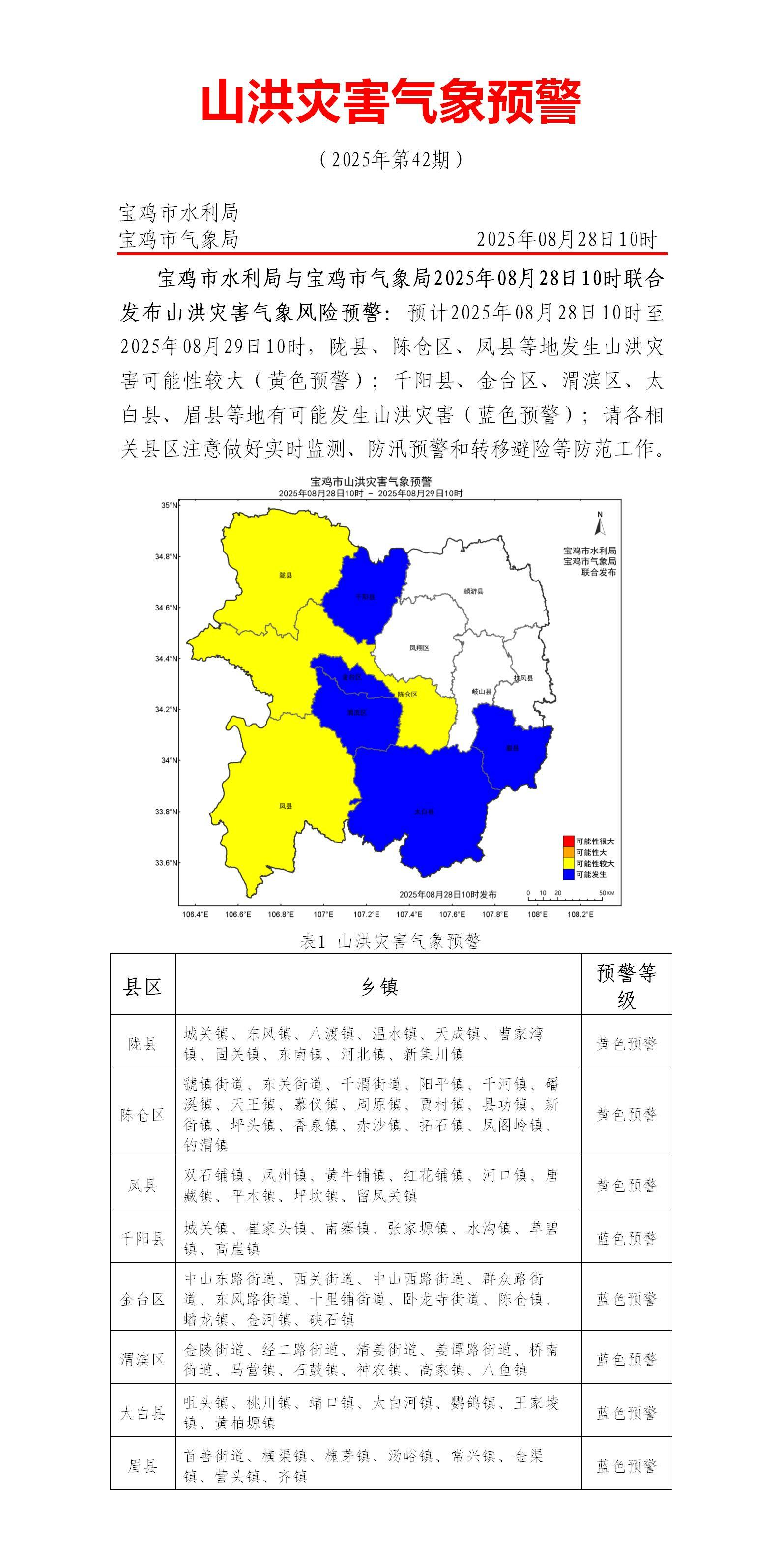 【寶雞市氣象局】寶雞市水利局與寶雞市氣象局2025年08月28日10時(shí)聯(lián)合發(fā)布山洪災(zāi)害氣象風(fēng)險(xiǎn)預(yù)警:預(yù)計(jì)2025年08月28日10時(shí)至2025年08月29日10時(shí),隴縣、陳倉(cāng)區(qū)、鳳縣等地發(fā)生山洪災(zāi)害可能性較大(黃色預(yù)警);千陽(yáng)縣、金臺(tái)區(qū)、渭濱區(qū)、太白縣、眉縣等地有可能發(fā)生山洪災(zāi)害(藍(lán)色預(yù)警);請(qǐng)各相關(guān)縣區(qū)注意做好實(shí)時(shí)監(jiān)測(cè)、防汛預(yù)警和轉(zhuǎn)移避險(xiǎn)等防范工作。