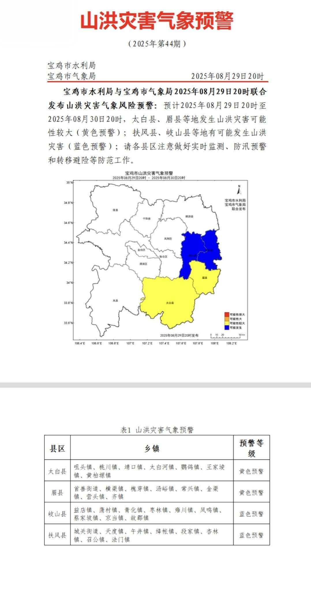 【寶雞市氣象局】寶雞市水利局與寶雞市氣象局2025年08月29日20時(shí)聯(lián)合發(fā)布山洪災(zāi)害氣象風(fēng)險(xiǎn)預(yù)警:預(yù)計(jì)2025年08月29日20時(shí)至2025年08月30日20時(shí),太白縣、眉縣等地發(fā)生山洪災(zāi)害可能性較大(黃色預(yù)警);扶風(fēng)縣、岐山縣等地有可能發(fā)生山洪災(zāi)害(藍(lán)色預(yù)警);請(qǐng)各縣區(qū)注意做好實(shí)時(shí)監(jiān)測(cè)、防汛預(yù)警和轉(zhuǎn)移避險(xiǎn)等防范工作。